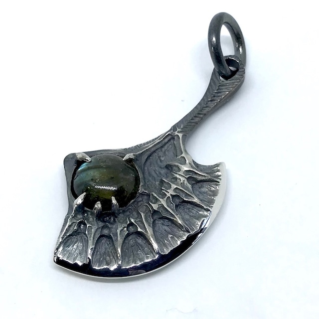テンガンムネエソが英名で hatchetfishes (手斧の魚)と呼ばれる事とテンガンムネエソペンダントSのデザインに合わせて製作 ラブラドライトは大きな目をイメージしている ※ラブラドライトは一点一点、色味が異なりますので写真と同じものにはなりません。 素材:シルバー925、ラブラドライト サイズ:H×66(バチカン含む)W×29 T×9(石含む)25g ※ペンダントトップにはチェーンは付属していません。 ※チェーンを付属する際はオプションからご希望の長さの物をお選びください。(最後の画像参照) ※受注生産品のお届けはオーダーから2~3週間ほどかかります。