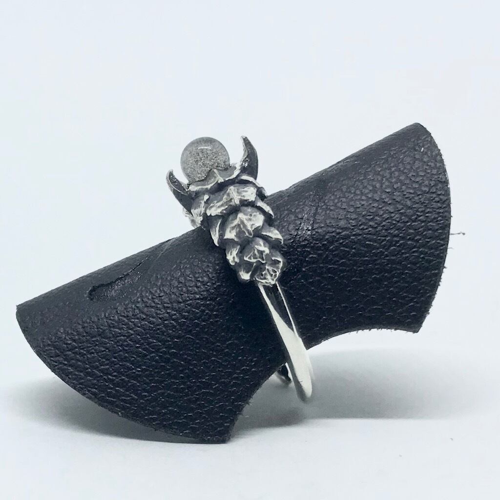 中央の石は通常のラブラドライトのほか、マツカサウオの体色をイメージした琥珀・オニキスの三種類からお選びいただけます