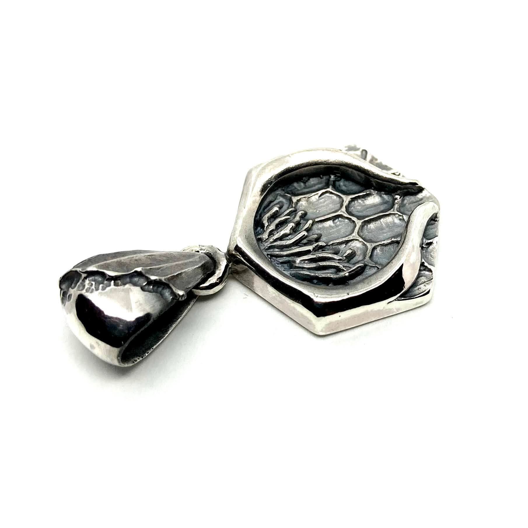 六角形のプレートをベースに六角形の鱗を彫り、鋭く曲がった牙の上部からはエラが生えた