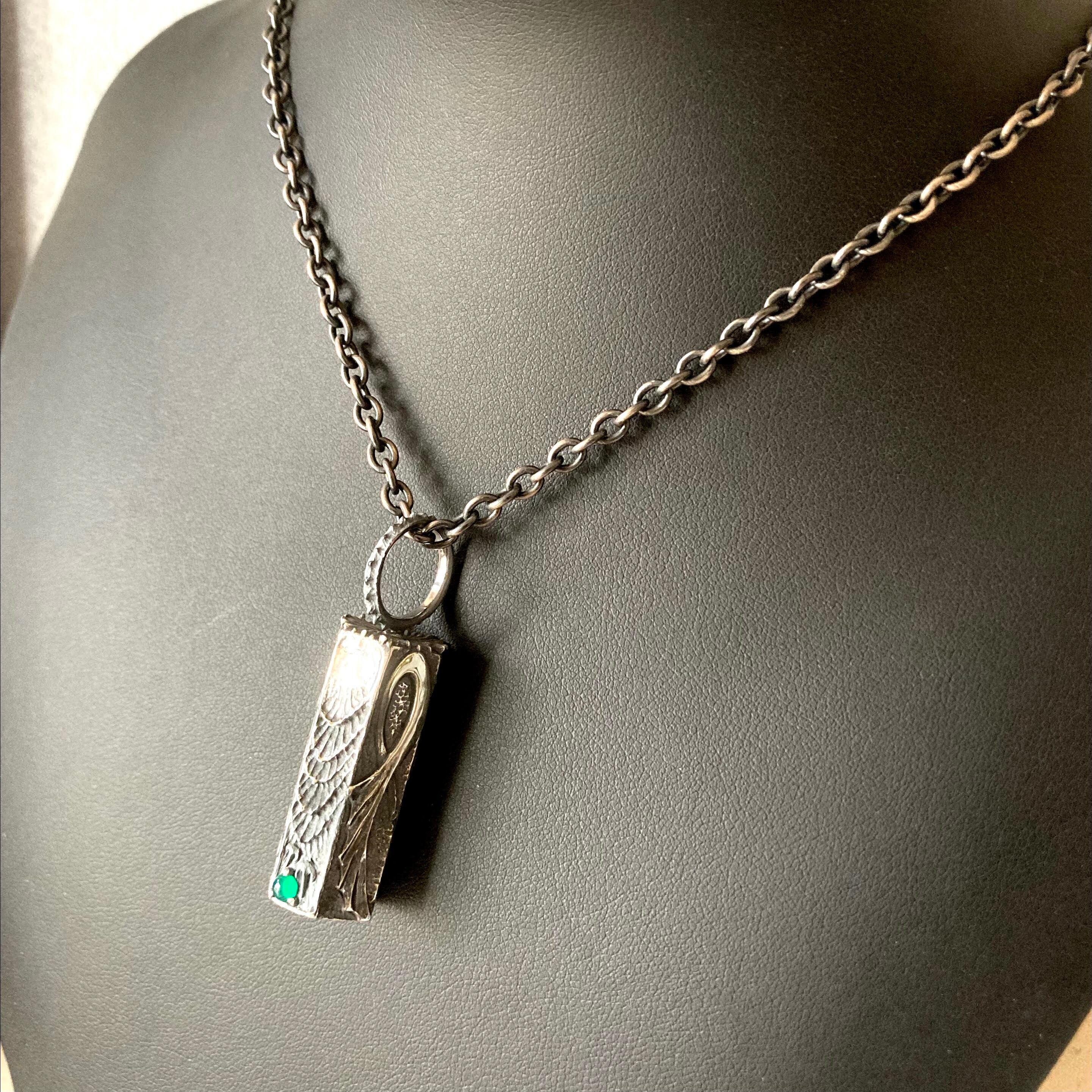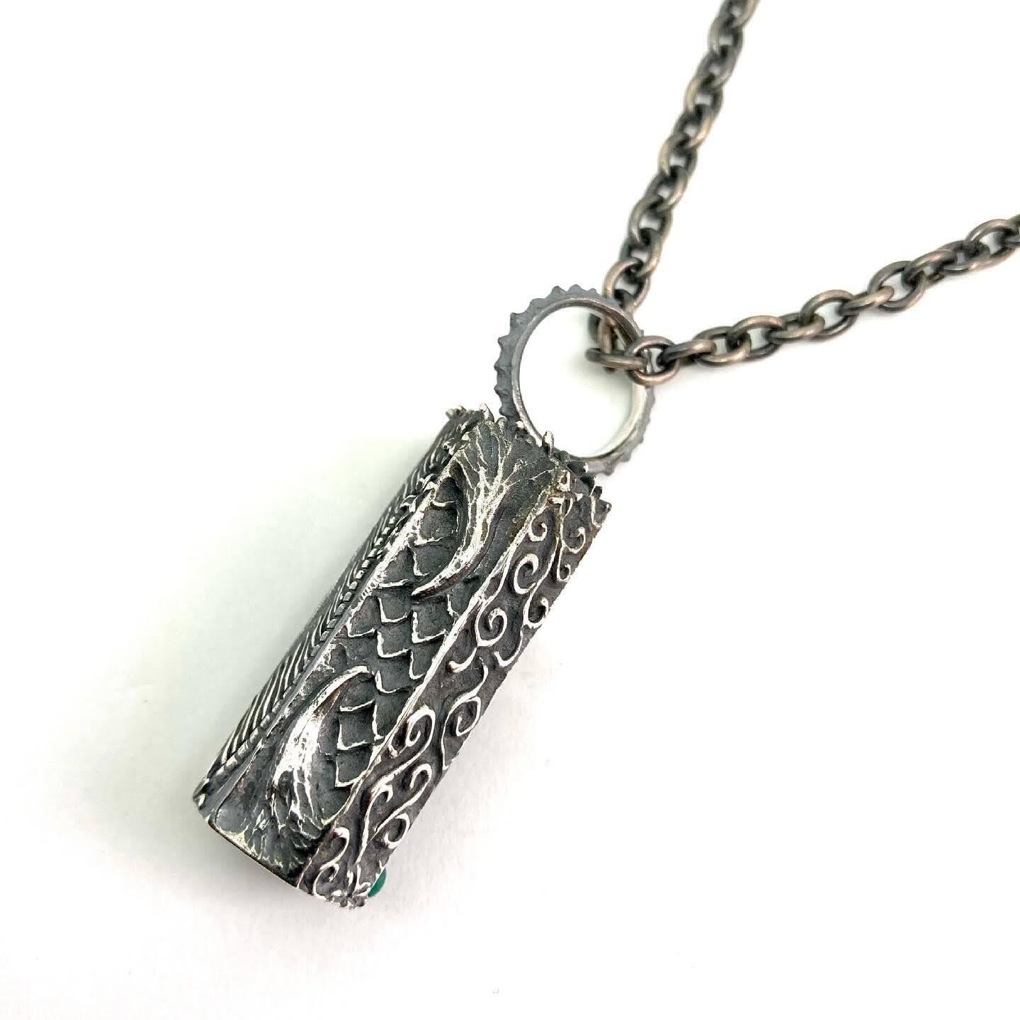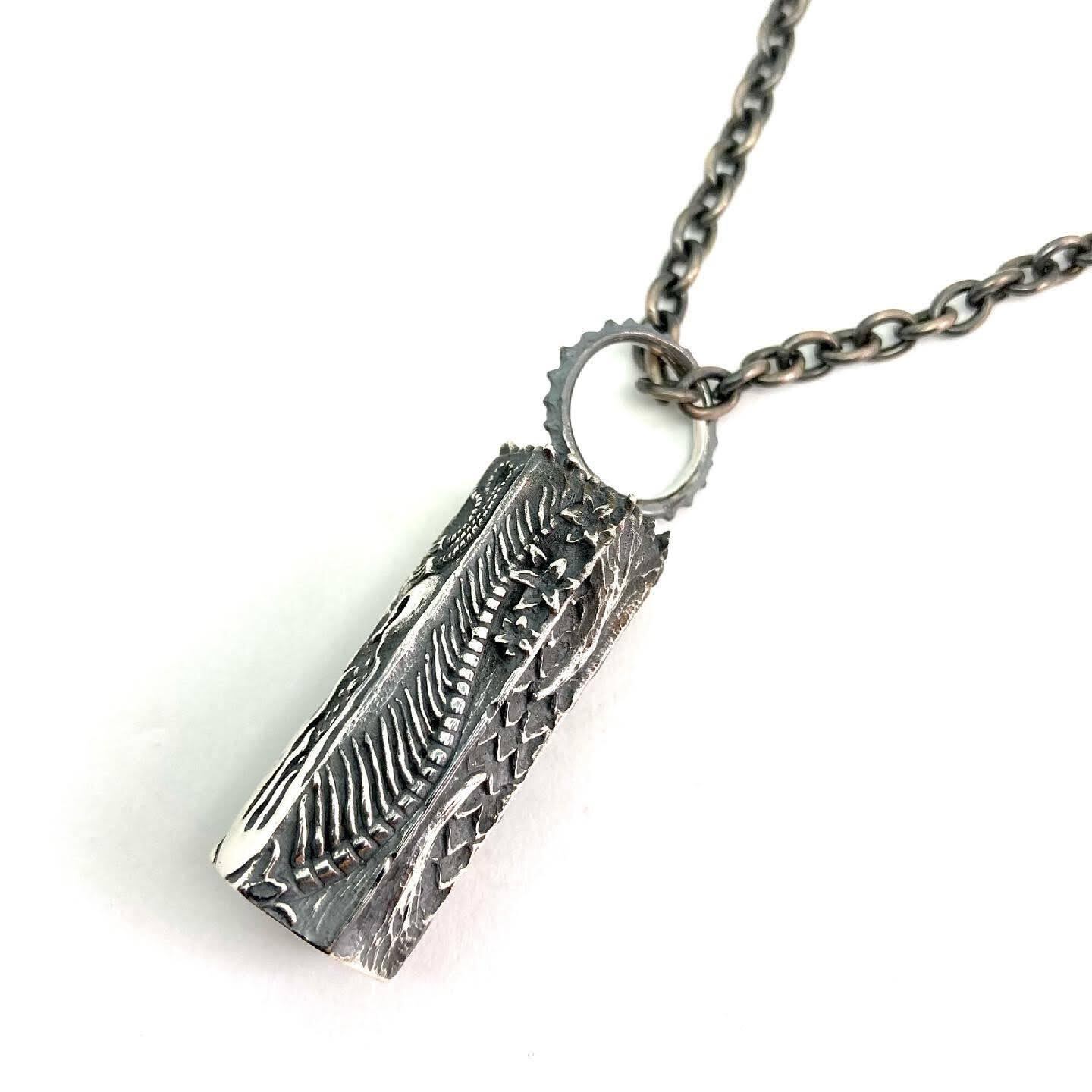 六角柱の面それぞれに、深海生物をモチーフとしたデザインを彫ったベルペンダント。